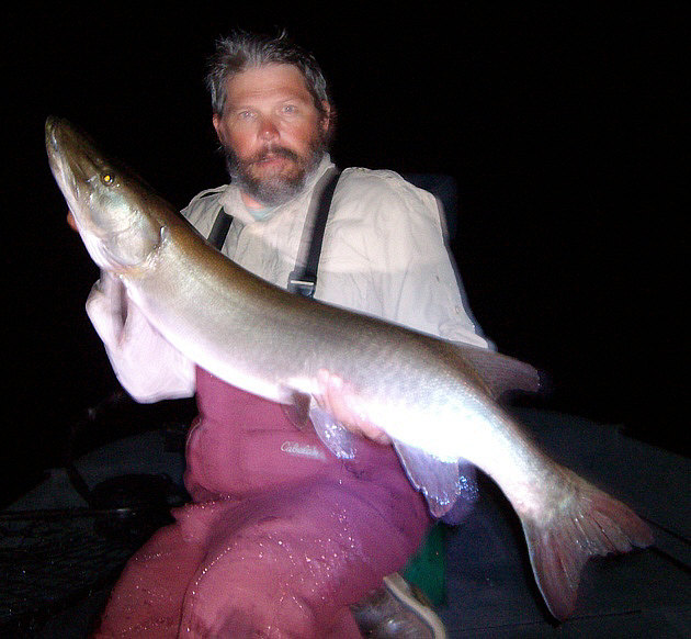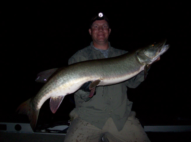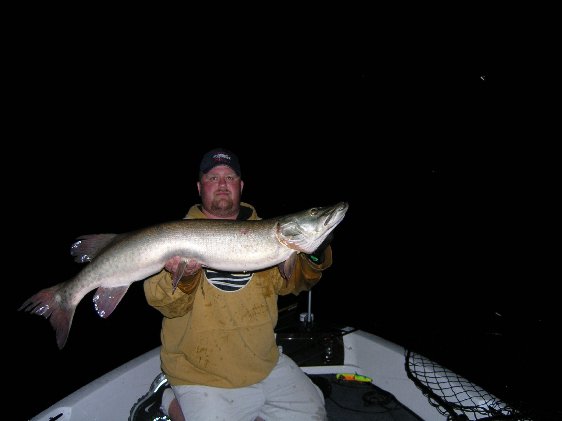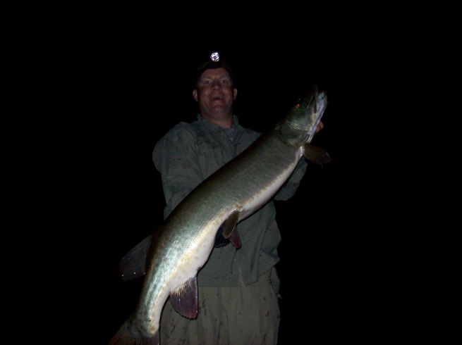 I agree, that much fishing knowledge in one place and nobody could get that hook out? Good position and actually a good hook to pull because of it's size. That would have been an easy one. the next time you take a 7/0 in the leg, give me a call and i'll come right over to pull it out the "easy way"... i decided to get back up on the horse that bucked me, so after replacing the hook that was in my leg, i tied on the BS Willy monster creeper that stuck me last night and put it to work on one of the spots we'd seen a nice fish earlier in the week. karma payed me back with a 51.75" beauty on the BS Willy monster. after a few celebratory brews and some dinner, we headed back out and revisted the fishing spot where i got stuck the night before. karma repayed me again with a fat 45" that ate the 10" Weagle. Attachments ---------------- verm 5175.jpg (97KB - 202 downloads) verm 5175b.jpg (45KB - 192 downloads) IMGP2869b.jpg (100KB - 201 downloads) 08-07-24c 004b.jpg (76KB - 190 downloads) | |||