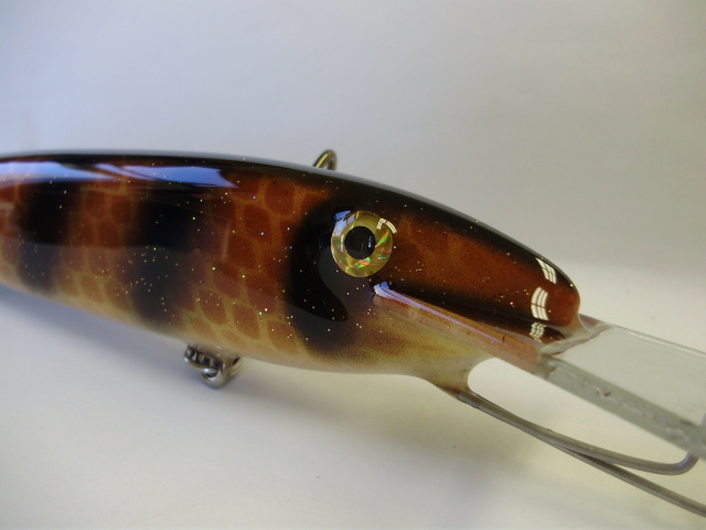Posts: 909 Location: South-Central VA | Yep, Kyle started carrying them for me this year. They are only available on my site and his site. Next year I'll have some 'show only' stuff available. I mainly do the python (natural skin, no paint), dark cobra, light cobra, and sea snake lures. I am doing the other exotic skins and hand painted skins upon request. I'm currently working on a batch of painted lures for a lady in MN but I have the bodies for my new skins just about ready to go. I'll post some pic's in the next couple of weeks. I'm open to suggestions on what color eyes to put on the baits with these 3 new skins. I have some glass eye blanks so I can paint them any color. jeremy | ||