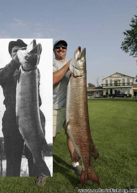 Posts: 67 | First off lets keep this respectfull , I see some valid points from both sides , that being said i don't believe that there has been a 69 lb fish caught yet , that is just going by the pictures and info available today , but i do believe it will happen in the next couple of years ,here on the Larry with the invasion of round gobies all spieces of fish seem to be increasing in size , smallmouth that used to avg 2-3 lbs are now avg 4-5 lbs , walleye on the bay of Quinte that were avg 10-12 lbs are now avg 14-16 lbs and guess what all are full of Gobies , it would only make sense that Muskies will show the same increase in wieght gain ,in fact i believe it has already show this with the numbers of large fish being caught in the last two years , our chapter is awaiting the results from Dr J Casselman on a 51 in that unfortunatly did not survive a release , it will be interesting to see what the stomach contents were and the average size of the forage , when this information is released i will post the results | ||