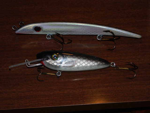 Posts: 638 Location: S.W. WI | Tylers Basement Creations 8" and 10" Twitchers. Gave one a few casts in late Nov. just before ice up, and they are gonna be great over weeds. Shallow runners with a BIG profile. -Jon | ||