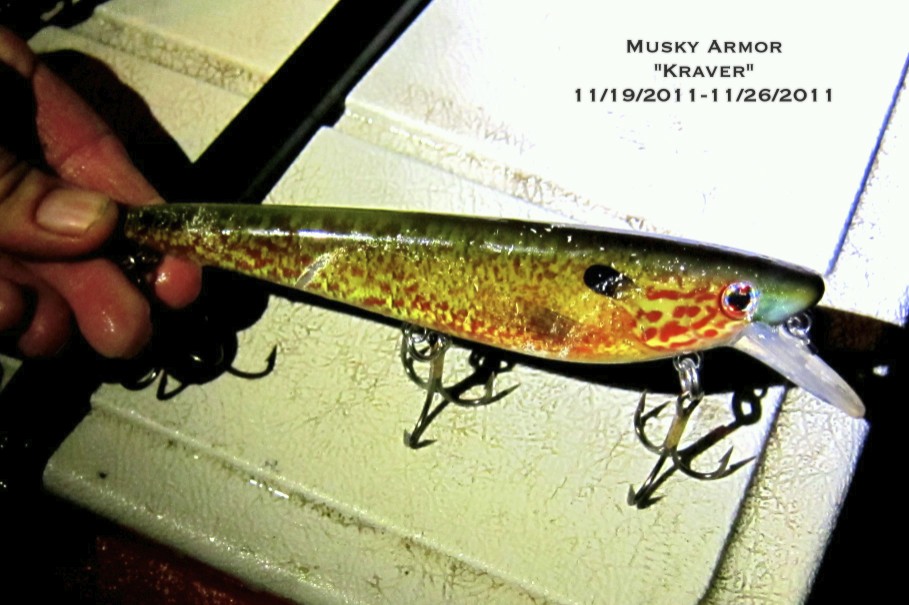 Posts: 1 | I wish I could make it to the show to stop by the Musky Armor booth. We had incredible success with the Kraver Jr. Pumpkinseed for fall Muskys. It couldn't miss! We fished this bait from September through the end of the season and had my best week ever with at least one fish every outing including my personal best. Here is a pic of the Kraver the last day of November which includes several hook changes from safe releases. Thanks guys and I look forward to seeing if my two new ones work as well in the Spring! Edited by MattM 1/7/2012 5:44 AM Attachments ---------------- Kraver Jr.jpg (123KB - 287 downloads) | ||