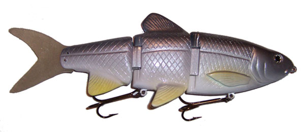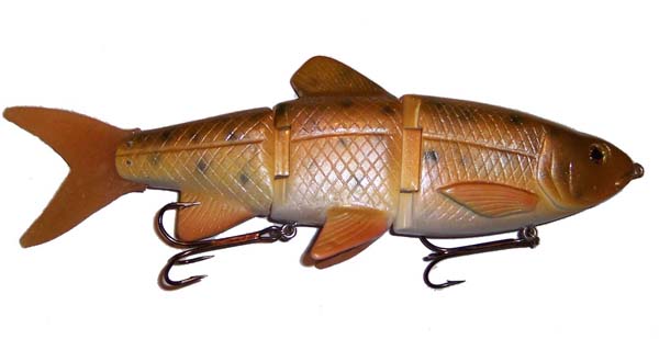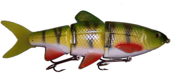 Posts: 179 Location: Sault Ste. Marie, Michigan | Here is a jointed perch crankbait that I have been working on and finally got it right. 8", 2.5 oz made of pine. Has great action and trolls in excess of 6 mph. http://i57.photobucket.com/albums/g225/rjbass/IMG_1739.jpg http://i57.photobucket.com/albums/g225/rjbass/IMG_1741.jpg Rod | ||