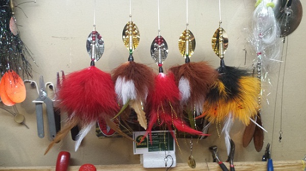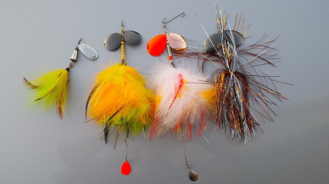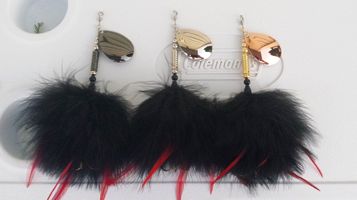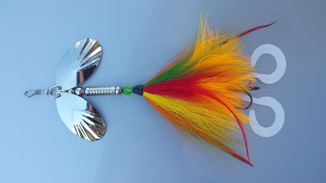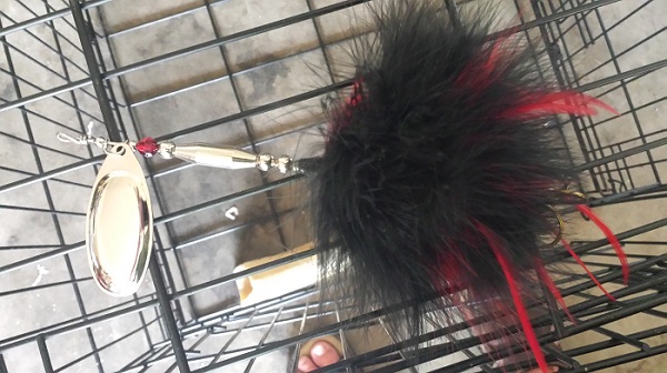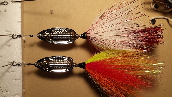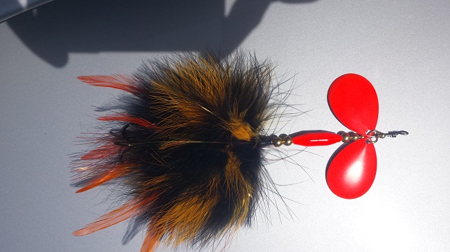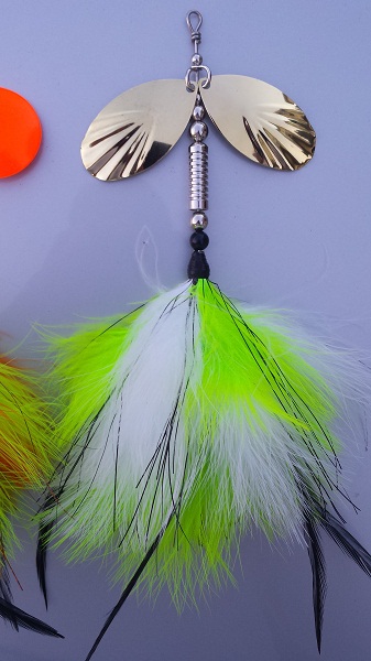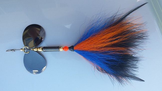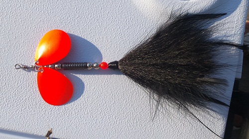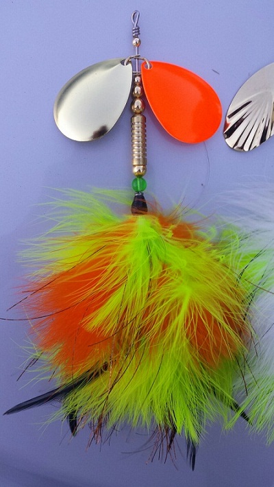 Posts: 345 Location: Poynette WI. | An ol reliable black and red with single french blade, not as flashy as some of the new styles but almost always good for a fish. I like the french blades because my friends are able to use this with smaller reels. After orange produced so well up north last weekend I decided to deck this one with bright double 8's for a friend of mine who will be visiting the same area in a couple weeks. Attachments ---------------- blackmarabouredhacklesilverfrenchblade.jpg (88KB - 389 downloads) blackorangemarabouflouorangeflashorange8blades.jpg (94KB - 370 downloads) | ||