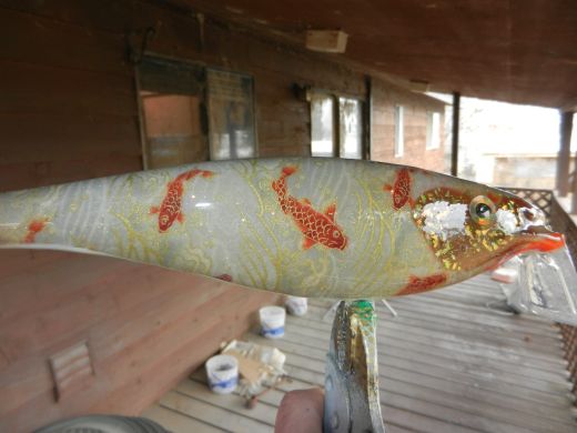 I'm not sure if this means "seize the day" or day of the carp. In any case I made this carp theme lure as a wedding anniversary present for the couple I fish with in Alaska. I know, "just what they needed." Hope they enjoy it.