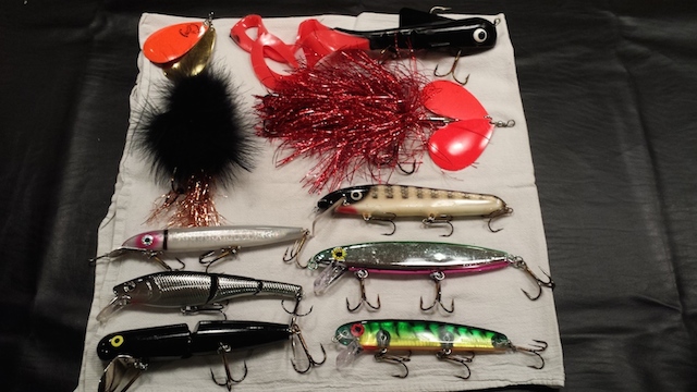 Left Side: Shumway Little Giant Flasher, 6" Cisco Kid (silver prism/pink), 6" Storm Swimmin Stick 16 (shad), 6" Mouldy's Hawg Wobbler.