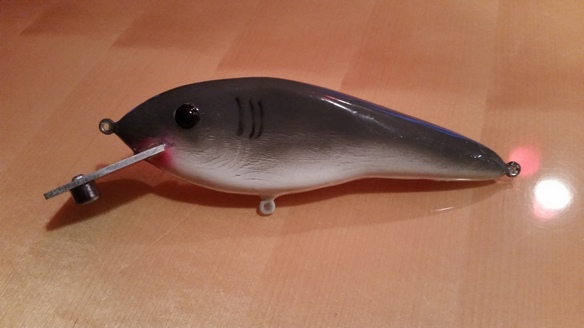 all the weight is in the tail and lip. putting a weight on the lip allows me to balance a finished bait to be more consistent from bait to bait as wood varies in density by increasing/decreasing the size of the lip weight. its quicker to do as well. float testing it, making changes to lip weight is a breeze, along with simple , contrasting paint jobs as shown will allow for more baits to be made in a busy life.