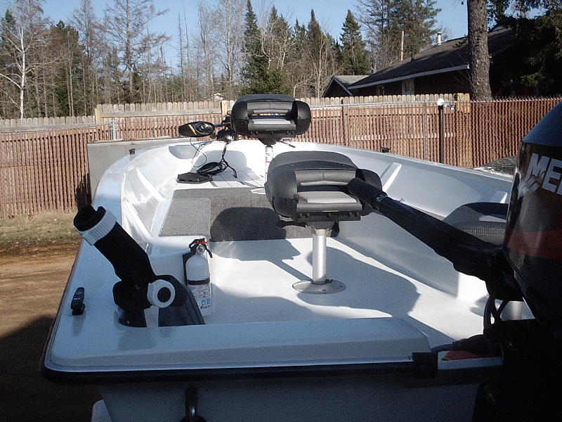Posts: 32954 Location: Rhinelander, Wisconsin | Here it is, all rigged and ready to splash next weekend. This is a Saltwater prototype model we sort of made freshwater with a front deck extension. Pretty neat boat. There is lots of room for tackle and a net, and the interior can be carpeted, wash down, or snap in carpet. The kid should be very happy!
