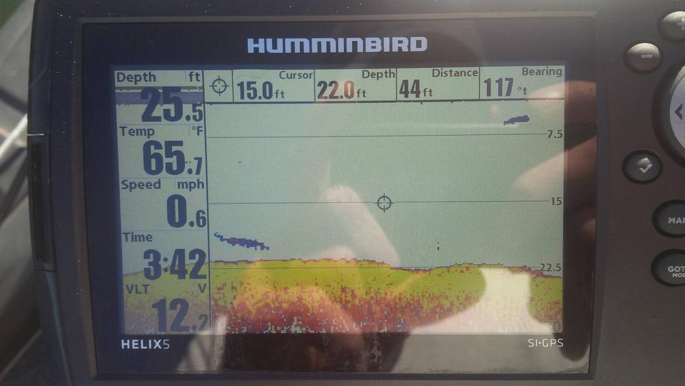 Forgot about this pic. It followed in and after going around the eight once it disappeared. At the end of the next cast I see this on the sonar. I never did get that fish to eat.