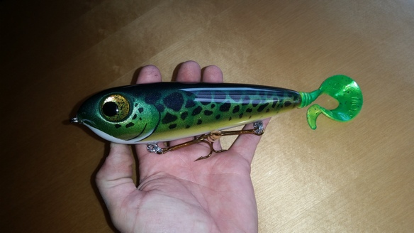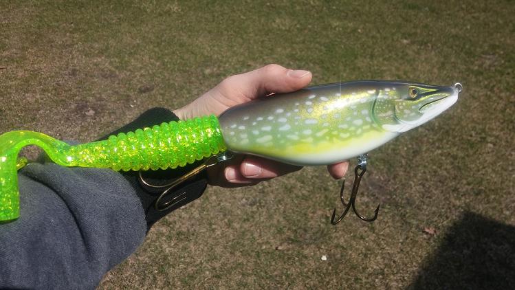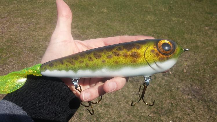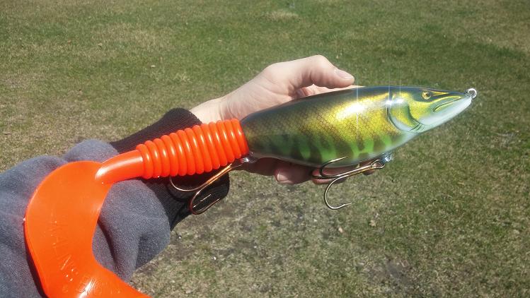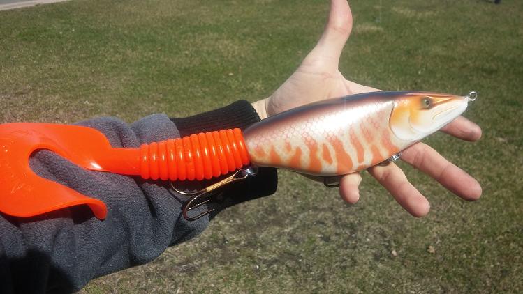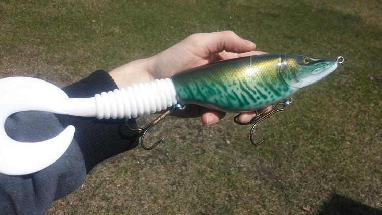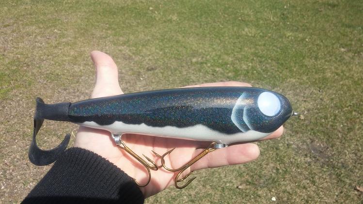 Posts: 410 Location: Waconia,MN | Here's what I've been working on. The Muskie Tamer is 7.25" and 10" with the tail, it had a good side too side action and glides really good outs quite erratic to sometimes it goes up or down on harder jerks and add on a nice belly wobble on the pause, it's sure to get slammed. The cannibal is about 15" long and weighs in at 13.5 oz. Works much like a hard head. Has great action which sometimes requires playing around with the tail which is secured be a coil that can be bent to adjust for different action. | ||