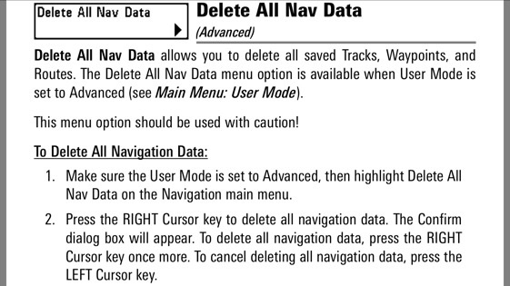 Press menu twice to get to main menu. Go to navigation. Go down to waypoint. Cursor right. Select delete. There should be an option to select all waypoint,routes and tracks. Then delete.