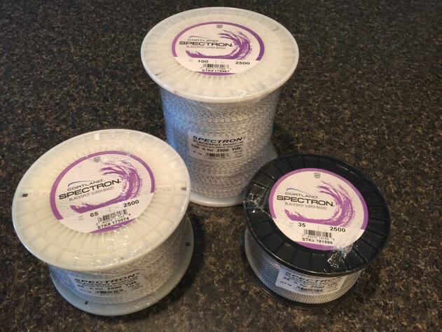 I am selling three (3) brand new 2500 yards spools of Cortland Spectron. Each spool is still factory knotted, brand new and unused. The 65 and 100 spools are sealed in plastic (the 35 is no longer in plastic but is still unused and factory knotted).