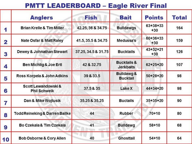 | Jump to page : 1 Now viewing page 1 [30 messages per page] Muskie Fishing -> General Discussion -> Miller and Krelle Win PMTT Eagle River |