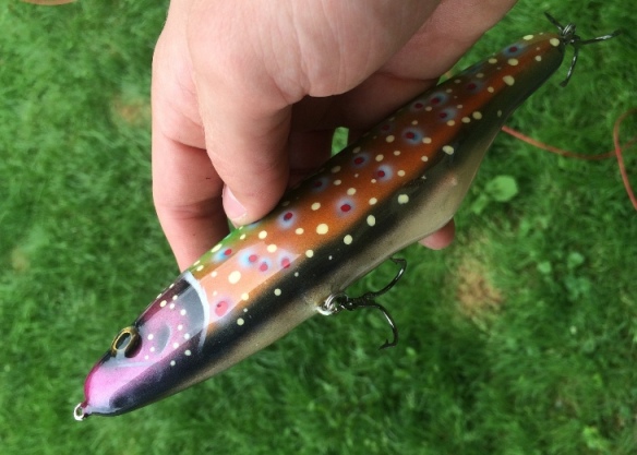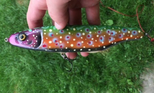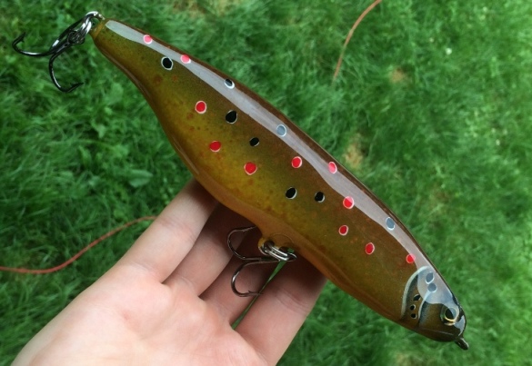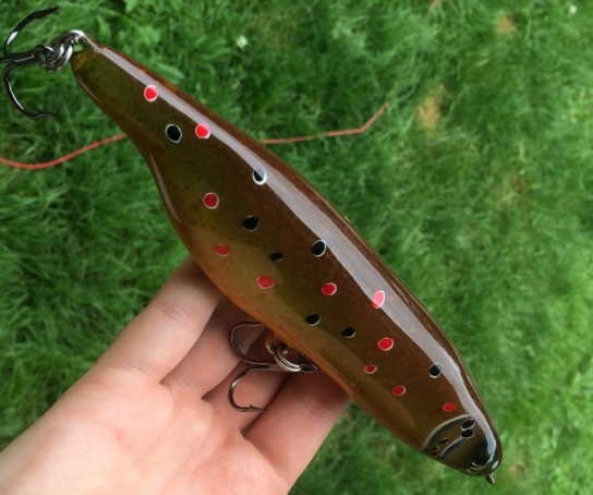 Thank you! The first one falls 10 inches per second and wobbles very wide. It is only weighed in one spot. Weigh 105 grams. The brown trout pattern floats and can be used as either a top water twitch bait or it will sink to 1-3 feet on a slow to moderate retrieve with a tight wobbling motion. Weighs 98 grams. I gave each of these away as gifts but I'll post a video eventually of a similar lure I'm finishing this week.