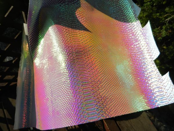 The color variations primarily come from shooting transparent paints over a textured, opalescent film attached to a cloth backing which is using in making purses. Transparent lacquers would really shine but I'm not up to the safety standards so I just shoot acryllics. Here's a picture of the material I use for siding.