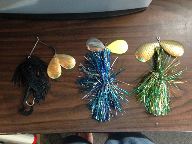 $8.00 each -(2) bucktails: a double 12 hammered gold/golden perch (SOLD) and dbl 10 emerald shiner