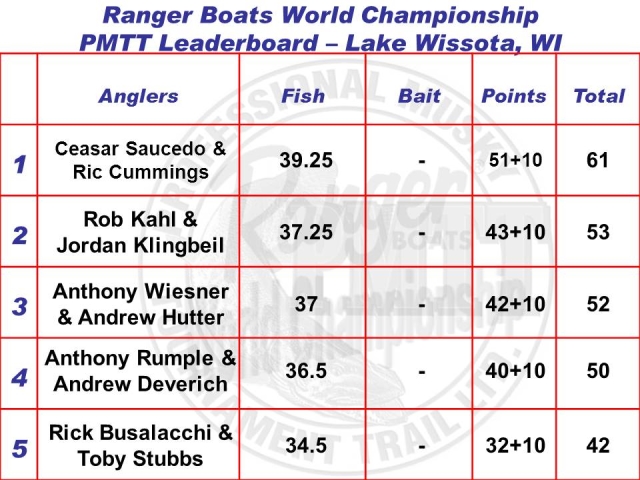 Posts: 32955 Location: Rhinelander, Wisconsin | A total of six fish were caught today. No doubles so its still any ones game! Day 1 PM images ! Top Six Teams 1- Ceasar Saucedo Ric Cummings 39.25" 2- Rob Kahl and Jordan Klingbeil 37.25" 3- Anthony Wiesner and Andrew Hutter 37" 4- Anthony Rumple and Andrew Deverich 36.5" 5- Rick Busalacchi and Toby Stubbs 34.5" 6- Kyle Weber Jordan Gustman 31.5'' Top 4 Teams Take to the Stage: PMTT Day One Attachments ---------------- RBWC15LBd1.jpg (198KB - 475 downloads) 31-39.25.jpg (258KB - 489 downloads) 30-37.jpg (232KB - 485 downloads) 21-36.5.jpg (235KB - 482 downloads) 19-34.5.jpg (208KB - 471 downloads) 14-31.5.jpg (254KB - 481 downloads) 2-37.25.jpg (274KB - 477 downloads) | ||