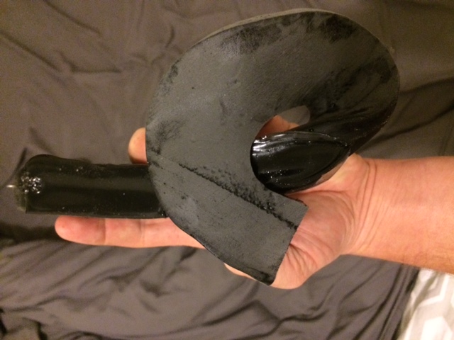 I love this forum and it has inspired me to start building my own baits. I started with pouring plastic using Alumisol and the Alumilite silicone mold material. The first thing I need to troubleshoot is the sheen or finish of the bait. You can see the belly of the bait, formed in the open air portion of the mold, is a shiny black and the part formed in the mold is a matte black. Did I need to sand my original with a finer grit? I used a 150 grit.