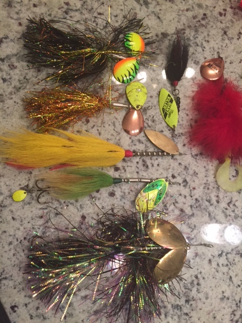 Lot 1: 7 Bucktails- (Mepps Musky Marabou, Mepps Musky Killer, Musky Mayhem double showgirls- Firetiger & Candy corn, Windel Harasser, Inhaler Single Blade, Brand new Musky Frenzy Size 10- Walleye) $70 tyd