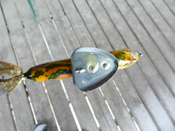 Posts: 695 Location: Moses Lake, WA | This lure is true homebrew - homemade mold, resin cast body, 2 mm ss thru wire. Too bad it didn't run for crap as either a musky or tuna lure. So I threw it in my junk box and let it age. When I first tested it I had also tried it as a vertically jigged vibration bait, but it didn't have much motion, so after aging I decided to add a plate (modified ss musky lip) to the bottom similar to the shape of my walleye metal blade baits. Once the lake thaws I'll get a chance to see if this addition gives this lure some action as a vertical jig. Attachments ---------------- DSCN2125.JPG (62KB - 362 downloads) DSCN2131.JPG (48KB - 377 downloads) DSCN2126.JPG (62KB - 370 downloads) DSCN2132.JPG (49KB - 371 downloads) | ||