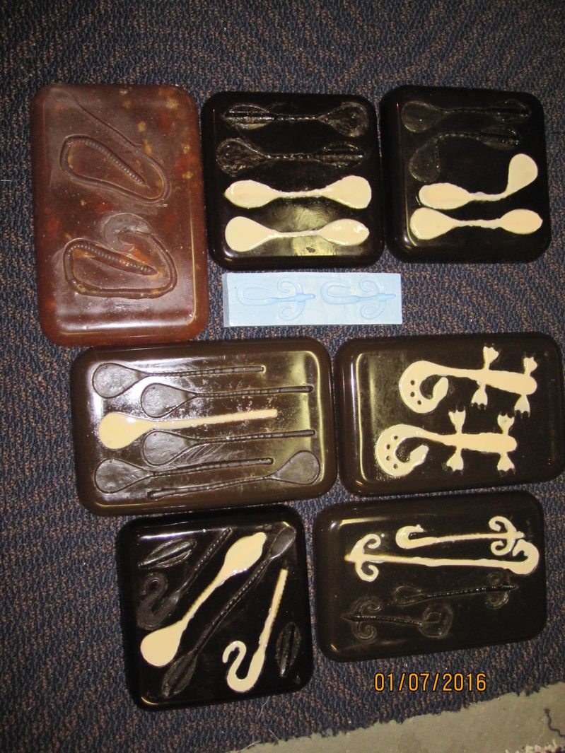 Here is a pic of some molds You Requested to pour soft plastics. Mostly Creature cavities, but some molds are of plastic worms, and sensation bass style baits.