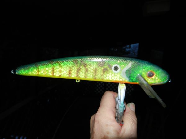 I found this inexpensive reflective tape that had both a hexagonal scale pattern and internal lines of square reflectors. Photographing it proved somewhat tricky for my limited skills. The lure is a Grandma blank with a Jake lip. It photographed better in the dark than it did in the light.