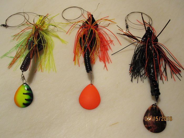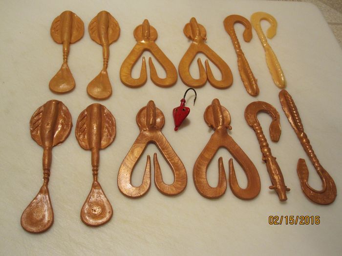 Excellent color for lakes with the rusty crayfish. All New, (Twin tail frog, Wide body paddle, and Fandango),+ Custom swimmer head...Colors,Pearl/ gold and pearl/copper...$13 shipped.