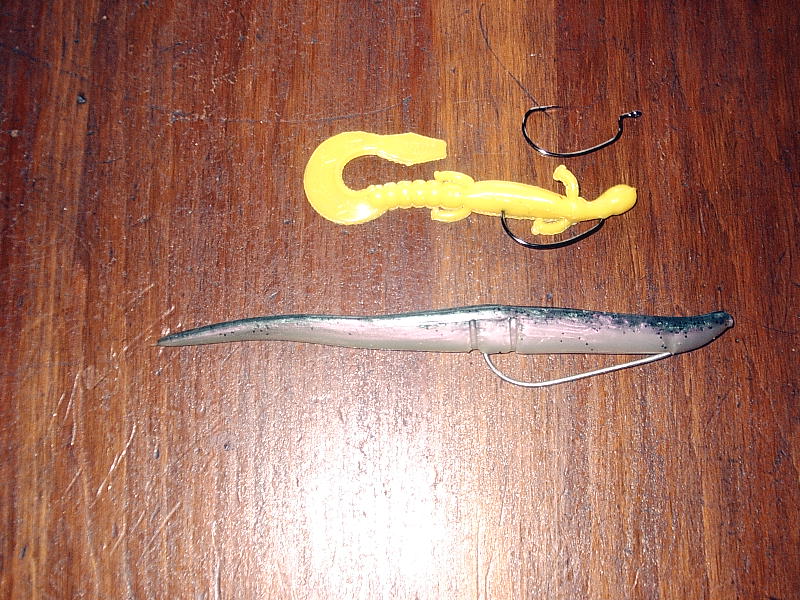 Posts: 32958 Location: Rhinelander, Wisconsin | 5/0 with the Creature, and 10/0 with the Sluggo, I think. It is a HUGE hook, and came with the bait. | ||