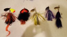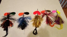 8's: 2 Homemade singles, 1 Eagle Tail, Musky Underground "electric bunny" style orange/black and Fire perch with orange tail. $35 shipped