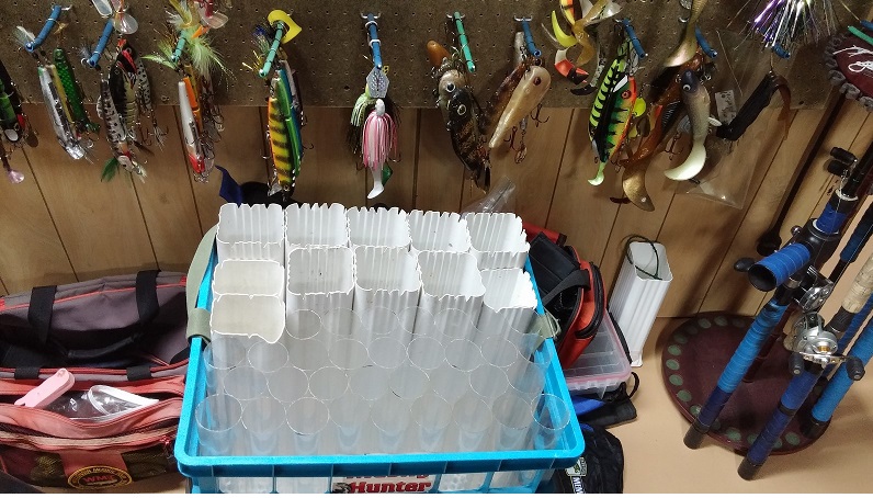 I also use the milk crate with downspout tubes, but in order to maximize space, I also use fluorescent light protectors, plastic tubes you can buy at big box stores (Menards, Home Depot, Lowes,...). They are big enough to hold bucktails up to #9 blades, small jerk baits (Squirkos, Depth Raiders, Grandma's, jigs, etc.). They are transparent, so you can see what's in them, and you don't have to worry about tangled hooks like you do in the downspout tubes. I customize the crate to hold whatever baits I plan to use on each trip.
