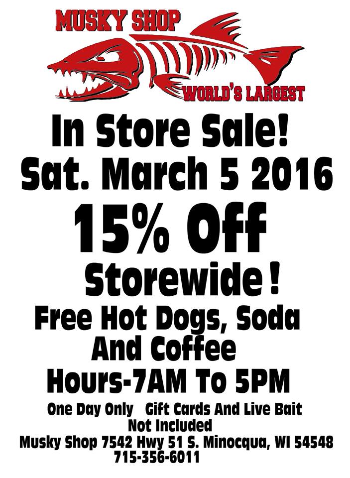 | Jump to page : 1 Now viewing page 1 [30 messages per page] Muskie Fishing -> Lures,Tackle, and Equipment -> Musky Shop In Store Sale |