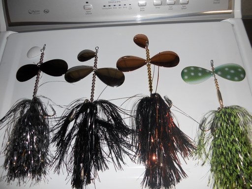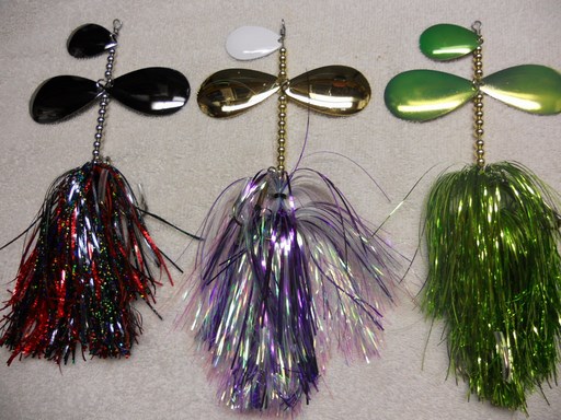 Posts: 1348 Location: Pewaukee, WI | Here's a few new ones I made up for a customer. The lighting leaves a lot to be desired, but the one on the left has two black nickel blades and a white top blade with a barred clear black skirt. The one next to it has silver blades, and the one next to the Pike bait has copper blades with a black and copper skirt. This is my second attempt working with the a three bladed bait this size. Attachments ---------------- DSCN1040 (Copy).JPG (69KB - 516 downloads) | ||