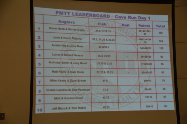 1st- Kevin Nash Richie Doyle 41.5'',37'',33'' 2nd- Josh and Kevin Rabska 38.5'', 34.25'', 30.25 3rd- Austin Vig and Drew Matz 40'', 38.5'' 4th- Lance and Darrell Seasor 36'',33.25 5th- Anthony Smith and Joey Reed 35.75'', 33.5''