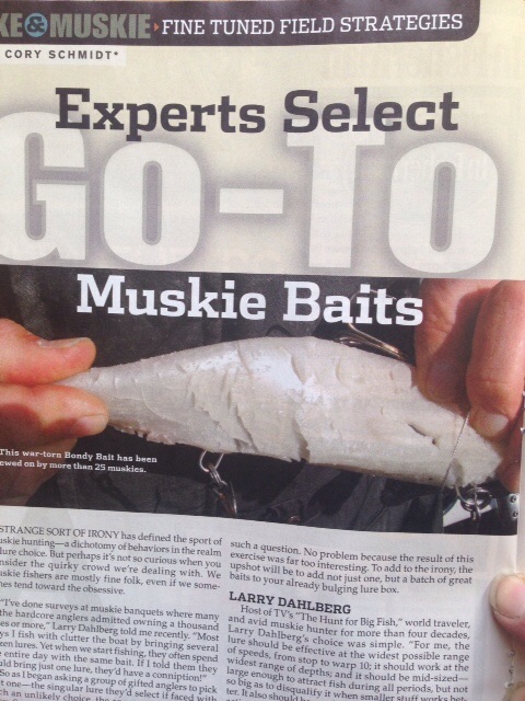 Haha yeah it might be a less glamourous lure used in a less than exciting fashion but once you become proficient at it you will be completely addicted. In the new 'Pike/Muskie' edition of Infisherman the Bondy is featured cover to cover. Here is a sample showing a well chewed bait... Thanks a lot, Jon