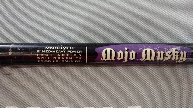 1) Mojo Musky: 8', medium-heavy power, fast action, split grip. Has some boat rash (tried to get good pictures), was always sleeved during transport, handle, eyes, and seat in good condition. $100