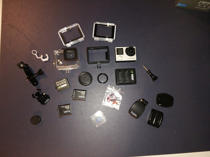 Includes: Gopro Hero 4 Silver, waterproof case, touchscreen backcover, open backcover, skeleton case, rubber stabilizer, several standard gopro mounts, hat clip mount, 3 batteries, dual battery charger, lens cap, clear protective lens cover, polarized lens, filters that fit in waterproof case (gray is polarized), 32gb sd card.