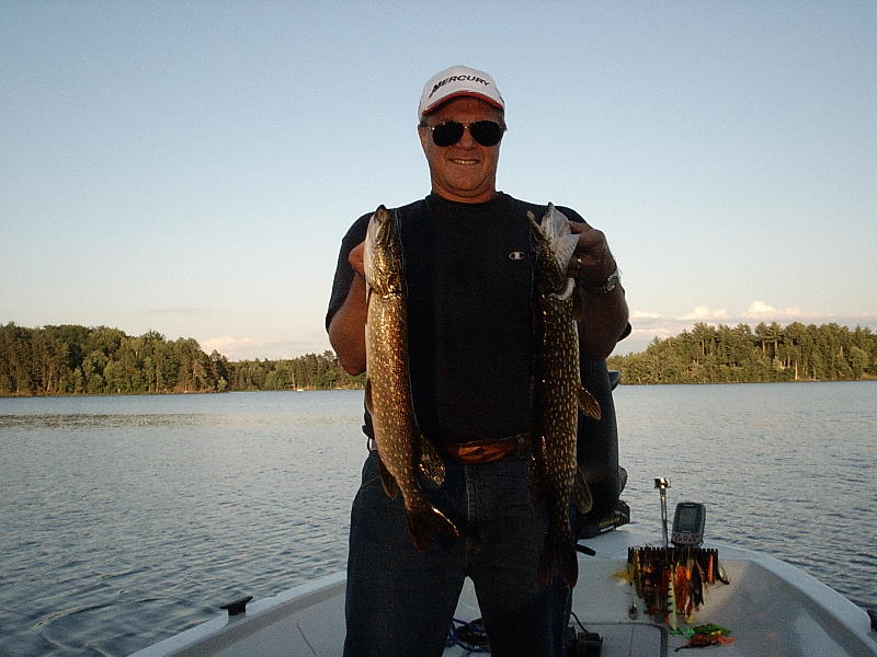 Location: Rhinelander, Wisconsin | Sue and I took the day off from Muskies and chased pike and crappies for dinner. It was a beautiful evening, and the crappies and pike were very willing. We found the pike in heavy cover, and took them on 1/4 ounce weighted worm hooks and plastic worms skipping them across the stuff until BOOM, a pike smacked the lure right through the pads. We hit moonrise perfectly, and the pike responded well. The lake also has muskies, not alot, but quality, in the same areas on the same pattern, so....Crappies were plentiful in 9', we caught over 50 and kept 20 on Cubbies and a bobber. Dinner was GREAT!!!!!