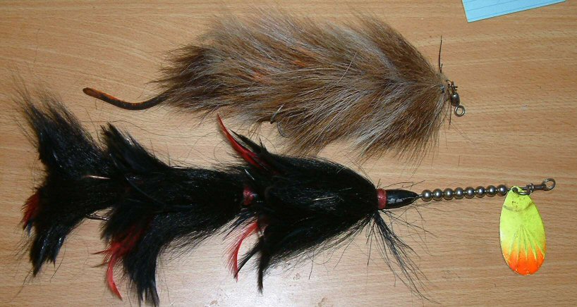 Anyone know the maker of these baits? Both are bout 20 yrs old. The rat looks really alive in the water, in that when it's paused its head comes out of the water like its taking a gulp of air. The spinner(about 16"long) is made with a bicycle spoke. The tie-on can be unscrewed to remove the clevis so a blade change can be made(scarry), however it does have a lock nut against it. Any ideas?