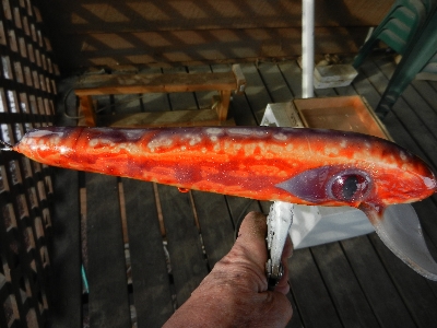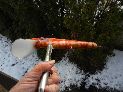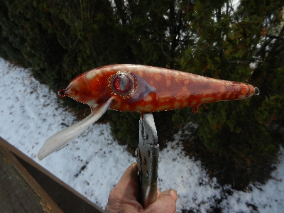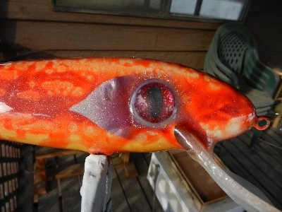 Every once in a while somebody escapes from the basement and runs amok in the neighborhood before the Thought Police in their little white uniforms are able to capture him. It's just possible I was tripping through the neighborhood when I made this bait. It's thru wired with a homemade lip and homemade eyes, red cedar, 10". The colors come from spraying Alclad II lacquer paints over wet epoxy while the lure is spinning on the dryer. Strictly basement from start to finish. It looks like a sucker that someone stepped on about 20 times before hooking up. I call it my Chernobyl Carp.