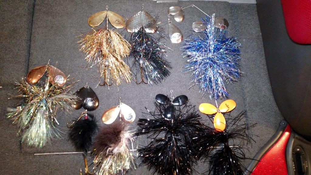Good variety. 1 cowgirl, 1 bigtooth tackle, 1 electric bunny, 2 musky frenzy triple bladers, 2 fudally bucktails, 1 musky mayhem hurricane. The electric bunny is in the worst shape (still works fine), all others are excellent condition.