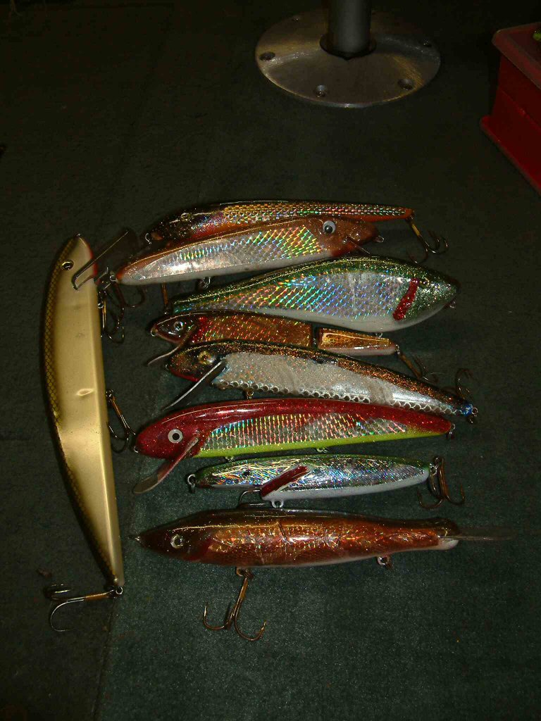 Location: NeverNever Lake | Jo, That's the only home made bait in the pic. I made that bait about 5 yrs ago and kinda used an old B-Flat as a guide. It's 10" long and weighs 8ozs. Its got so much flash it raises dead fish up from the bottom...lol