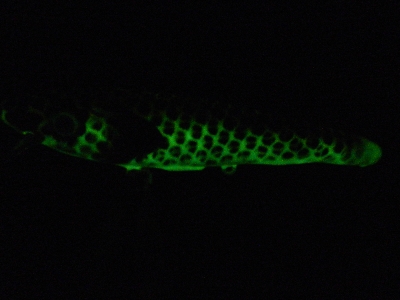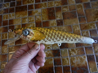 This bait was made to be fished shallow, hopefully over weeds, two rare earth magnets embedded on the belly to hold the belly hooks flat to the body. The white pigmentation is an epoxy/glow pigment mix that glows in the dark, so the sides and belly will light up when fished at night.