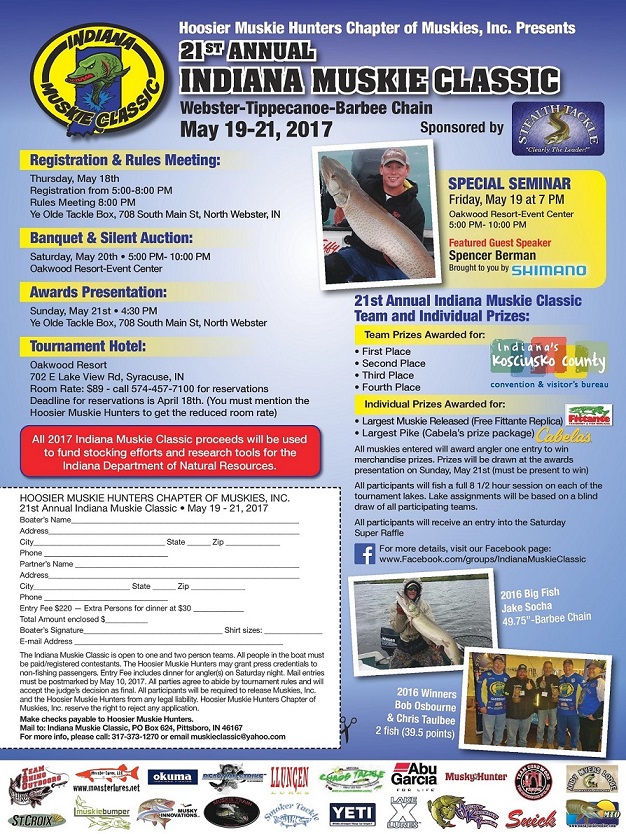 Posts: 37 | Yes, there is a 2017 Indiana Musky Classic...preparations are well underway, and this year promises to be another fantastic event put on by the Hoosier Muskie Hunters (Chapter 42). You can download a more information/registration flyer at https://www.facebook.com/HoosierMuskieHunters/ or https://www.facebook.com/groups/IndianaMuskieClassic/ The tournament lakes are Webster, Barbee, and Tippe; these are still the crown jewels of Indiana musky fishing and offer great opportunities. The Indiana DNR has taken steps to address population density at Webster through continued stocking with the addition of overwintered fish stocking. The Goshen News has an article that speaks to this: http://www.goshennews.com/news/local_news/dnr-stocks-larger-muskies... Webster continues to be the brood source lake for stocking all the other Indiana muskie lakes, so there is that too. Indiana musky fishing looks to be in great shape for years to come. | ||