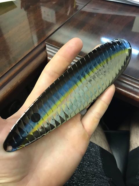 Posts: 32954 Location: Rhinelander, Wisconsin | It's a flutter spoon, and the bass guys are tearing up the big largies on it shelf fishing and jigging. I've seen a bunch of pictures of two bass at a time with one on the front optional stinger and the other on the back treble. They offer a nose spinner for it also. I just ordered two 8" models to try on muskies and pike. They make a Super Magnum too, 1" longer. I think I'm going to like the lure... Take a look here . Attachments ---------------- 8FS1_grande.jpg (8KB - 580 downloads) 19397158_1374988815903760_3884701358804825554_n.jpg (45KB - 558 downloads) | ||