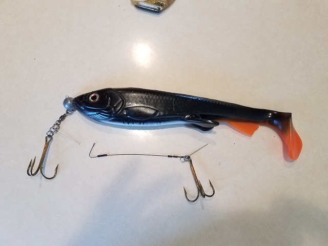 13" TRO Wolfecreek shad with 1.5oz. headweight and harness. Used for 3 casts, the external rigging pulled free at the end when hanging from the rod hook hanger - appears to have just been a poor crimp job when it was first assembled so all it needs is to be re-crimped properly. Rigging is $9 separate and shad body is almost $30 I am asking $25 shipped CONUS.
