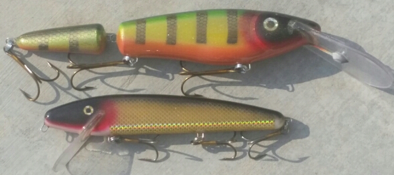 Two slammer crankbaits 10" Jointed Deep Diver and 8" Minnow Crankbait $35 shipped or open to trades looking for wooden Tuff Shad Gliders, Cobbs, Pearsons, Smuttly Dogs or anything else interesting.