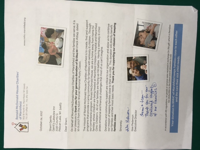 Posts: 290 | The Ronald McDonald House wrote this on Facebook . Thank you to everyone who helped with the tournament!! Donations and community support are critical to RMHC and allow us to continue our mission of keeping families close to their sick child. On September 9, Gerrits' Lakeview hosted their 26th Annual Kevin Worrall Memorial Musky Classic to benefit Ronald McDonald House Charities of Marshfield.