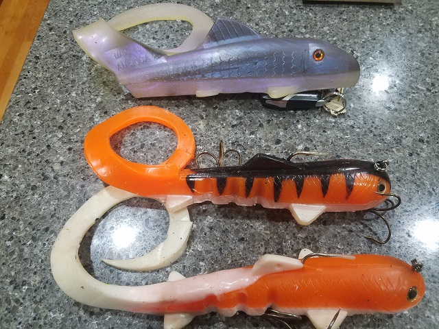 Rubber lot for sale including Mammoth Shack Attack Curly Sue. None of these have been used. Curly Sue needs hooks.