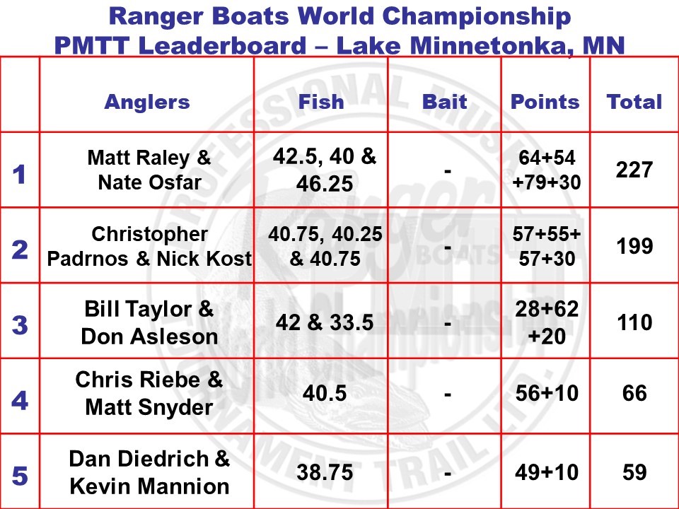 | Jump to page : 1 Now viewing page 1 [30 messages per page] Muskie Fishing -> General Discussion -> Raley & Osfar Lead Day 1 PMTT Championship |