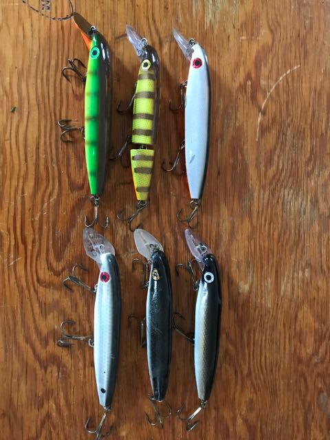 Set of 6 Pre ROI depthraiders including a Miller Perch pattern with painted lip and a Rollie and Helen's custom Cisco. All but the Miller Perch have been fished.