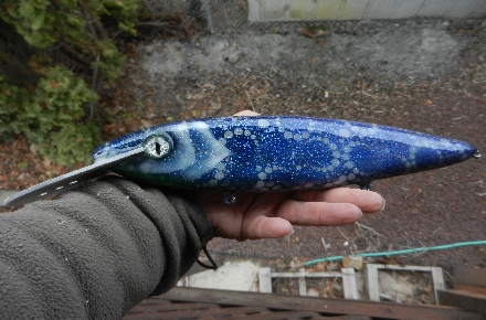 About this time in the winter I always feel a little blue and like I'm running around in circles, so I made this lure to celebrate my confusion. 12" basswood, single rattle chamber, single knocker, aluminum lip.